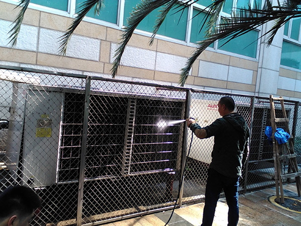 4、洗凈表冷器里層間隙內的灰塵后,用高壓霧化水噴吹,操作時應防止盤管鋁翅片折彎、變形,一邊噴吹一邊用吸塵器收集灰塵及污水;