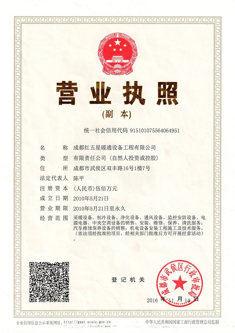 成都紅五星暖通設備工程有限公司營業執照